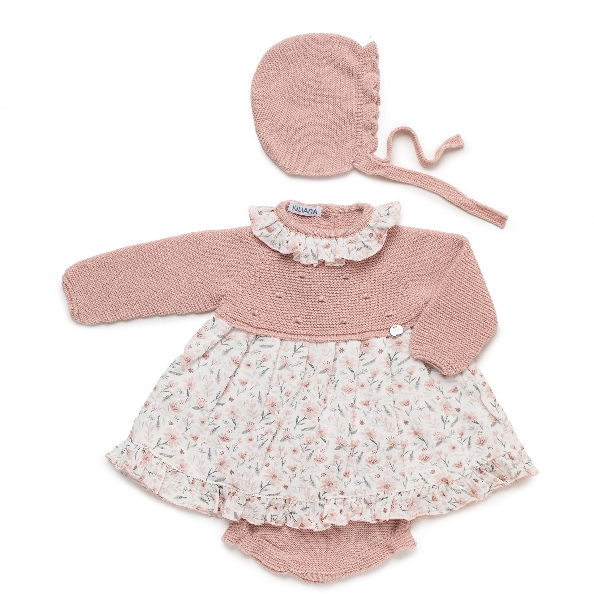 Vestido corto de manga larga en punto y tela de flores, con gorro y ranitas para bebé