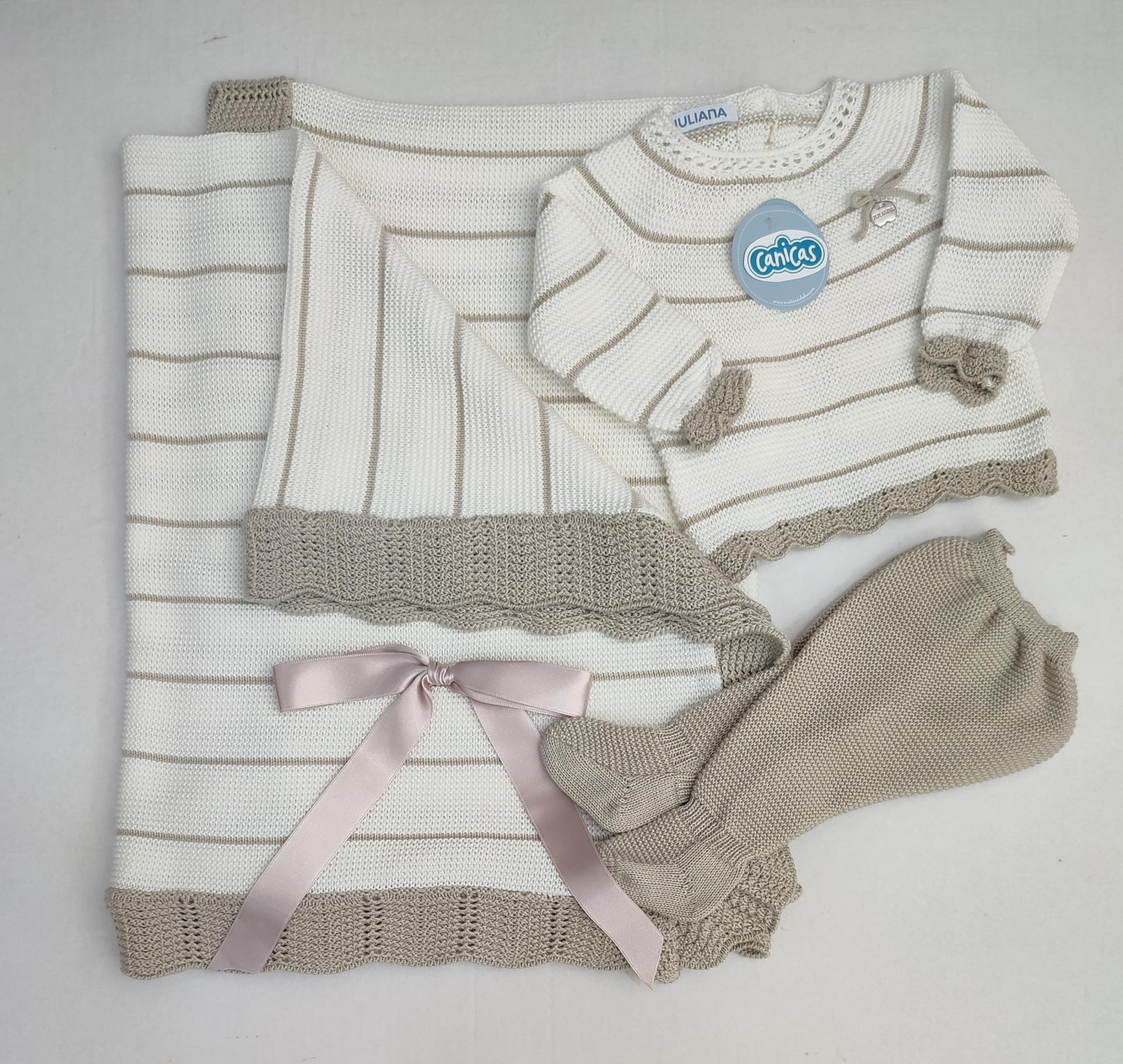 Conjunto unisex de 2p para recién nacido, bolero manga larga rayado BICOLOR y polainas lisas. Juliana ropa bebé primavera verano.