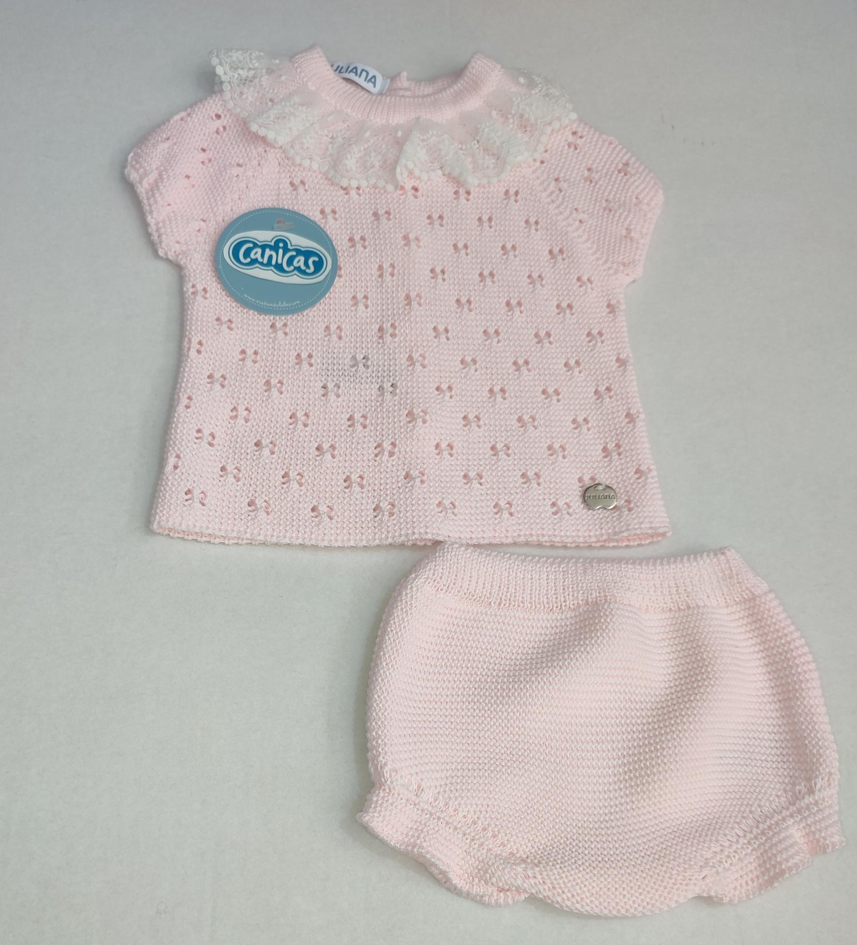 Lleva a juego braga cubrepañal en punto liso de hilo rosa.