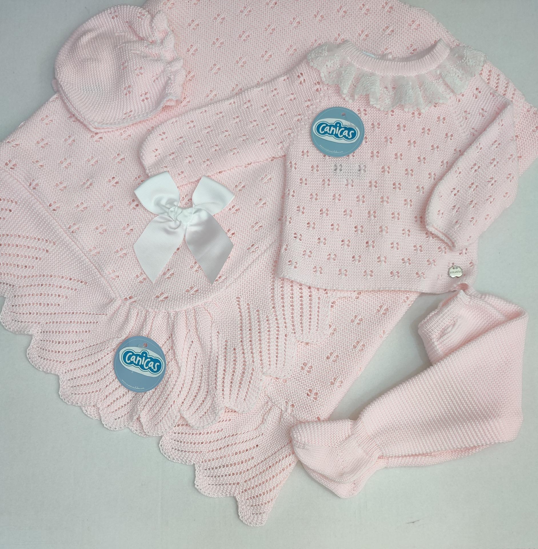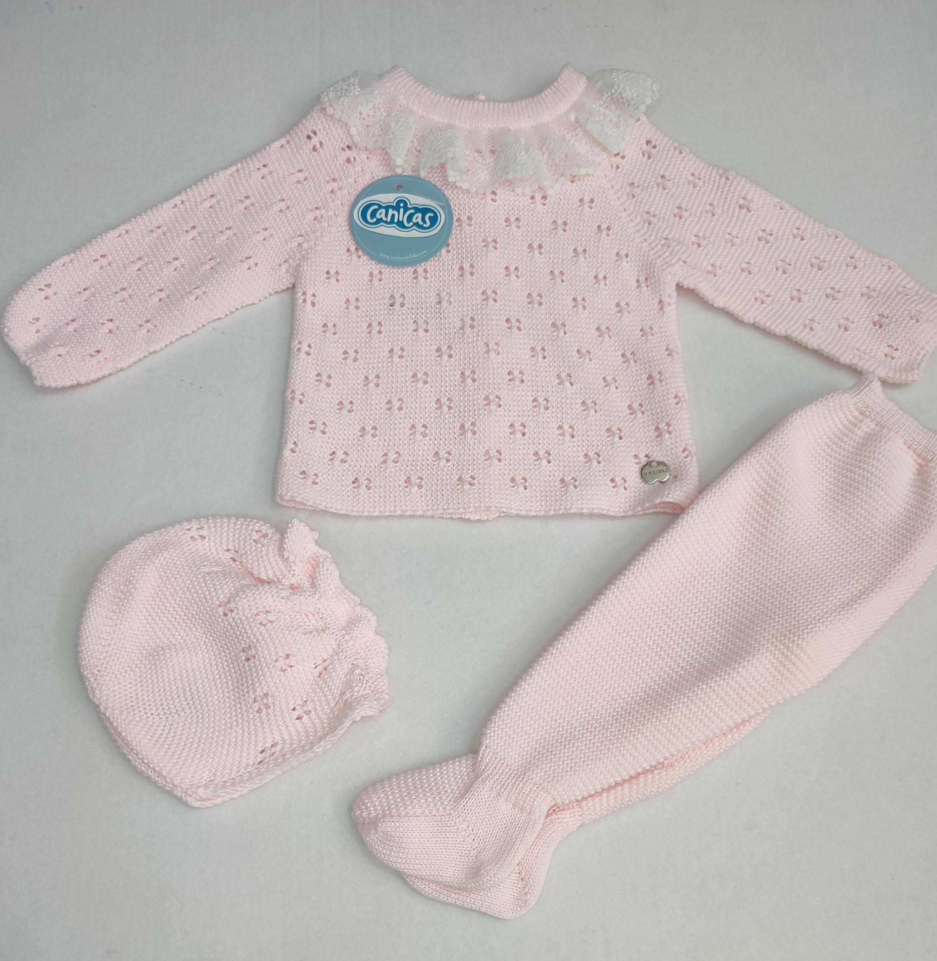Conjunto de 3p para recién nacida, bolero manga larga calado, gorrito y polainas lisas. Juliana ropa bebé primavera verano.