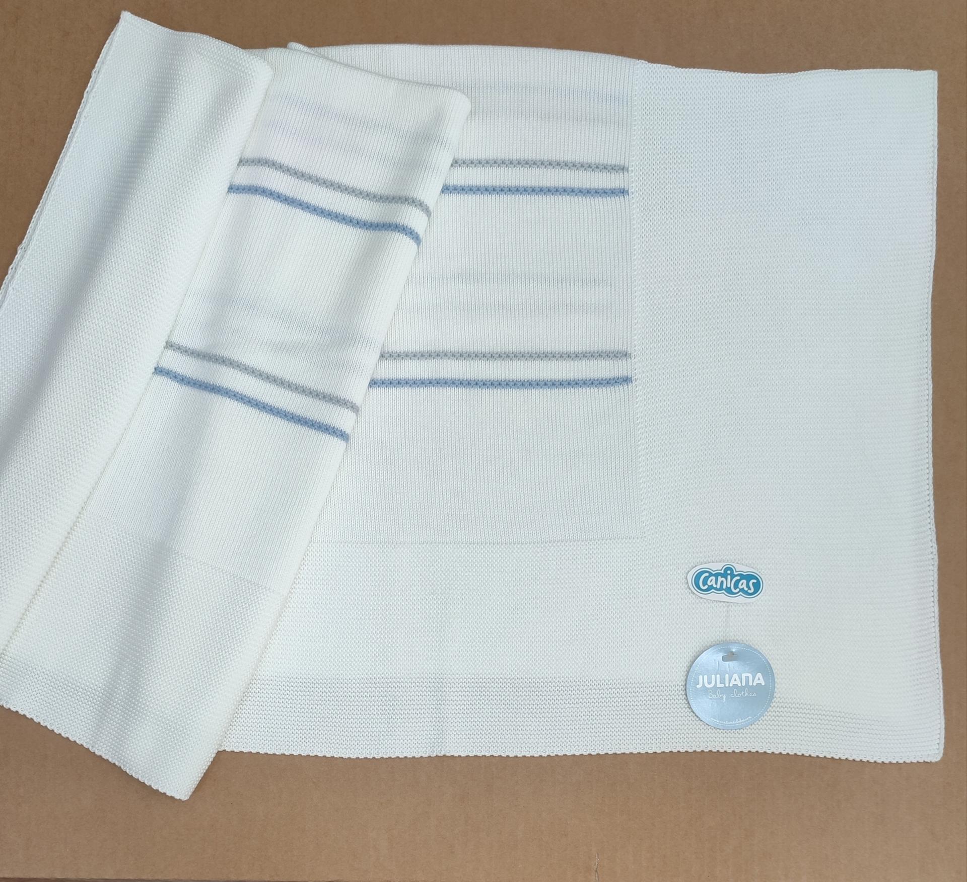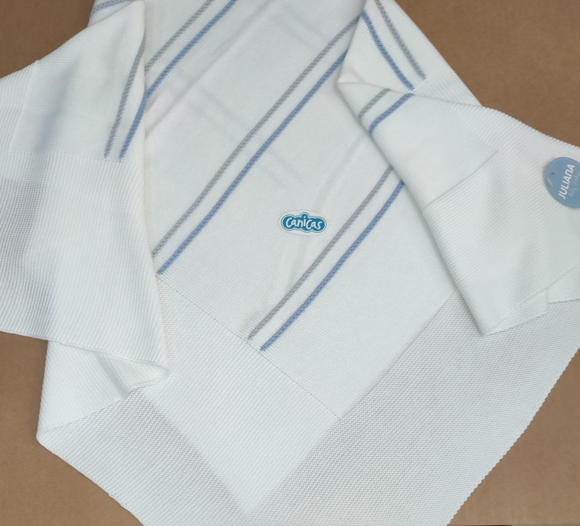 Precioso chal toquilla bebé recién nacido de la colección Juliana primavera verano, elaborada con un hilo perlé en color blanco, gris perla y azul cielo. Un tejido acrilico 50% antialérgico y algodón 50%, fibras naturales de tacto fresco, suave, delicado y dulce, para que tu bebé luzca muy guapo y cómodo.