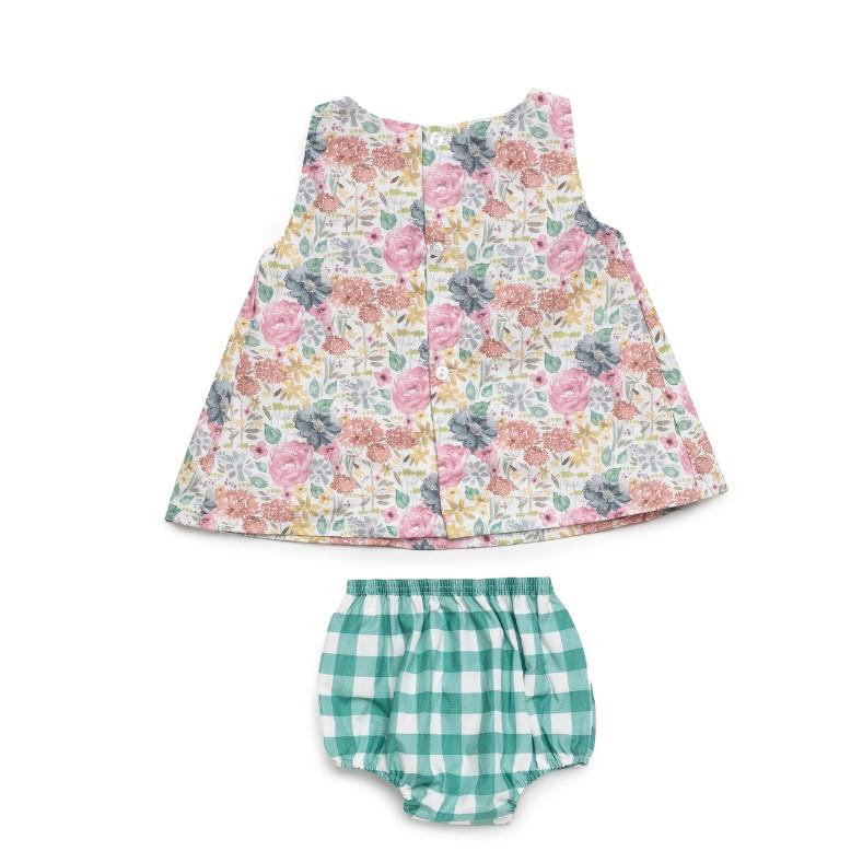 Vestido corto y braga estampado flores y cuadritos vichy.