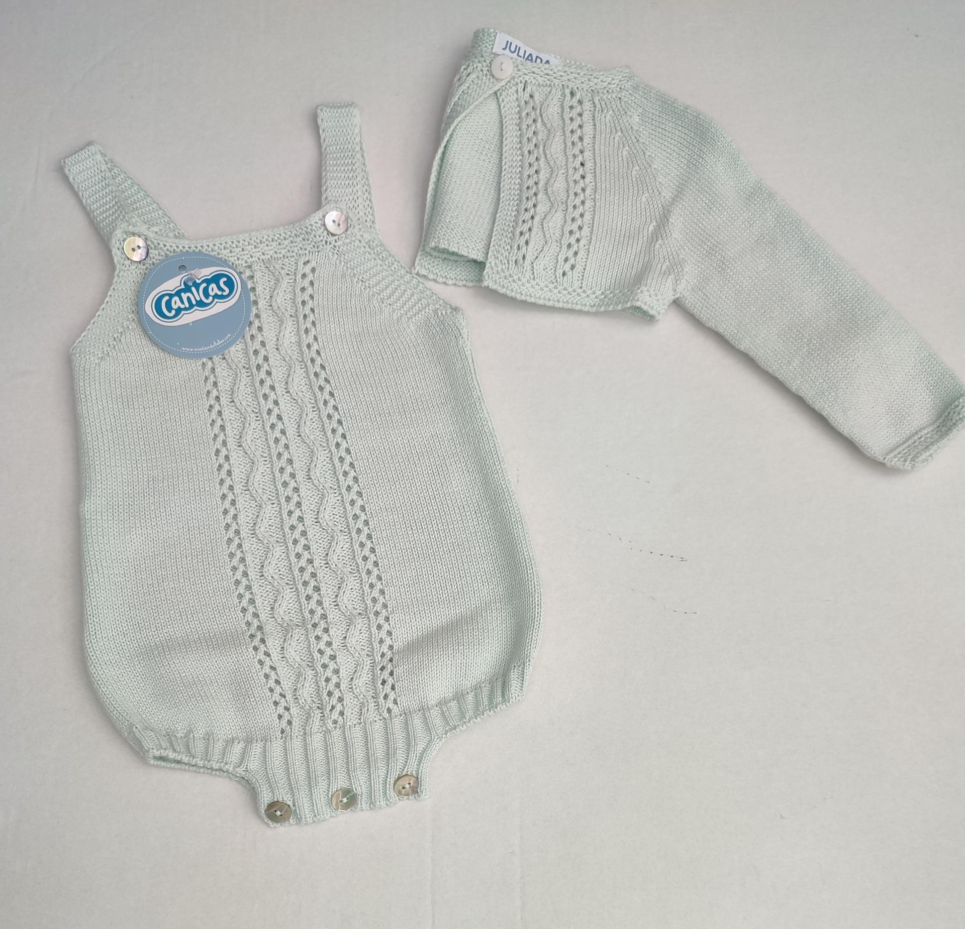 Pelele de tirantes en hilo con calados. Fabricado en España 100%. Ropa bebé primavera verano.