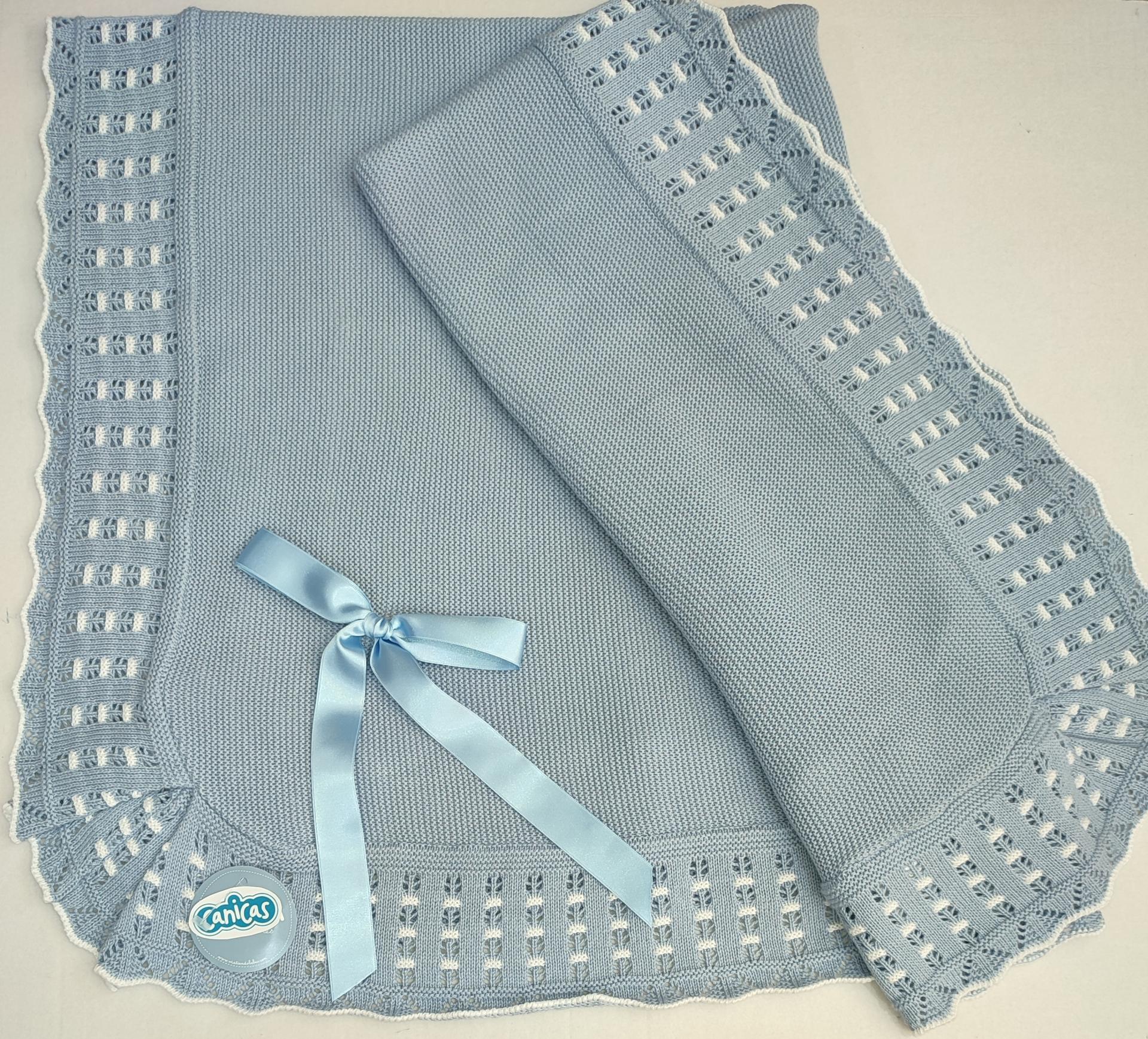 Original chal toquilla para bebé recién nacido de primavera verano. Confeccionada con un suave y fresco hilo perlé en color azul cielo y blanco. Un tejido acrilico 50% antialérgico y algodón 50%, fibras naturales de tacto delicado y dulce, para que tu bebé luzca muy guapa y cómoda.