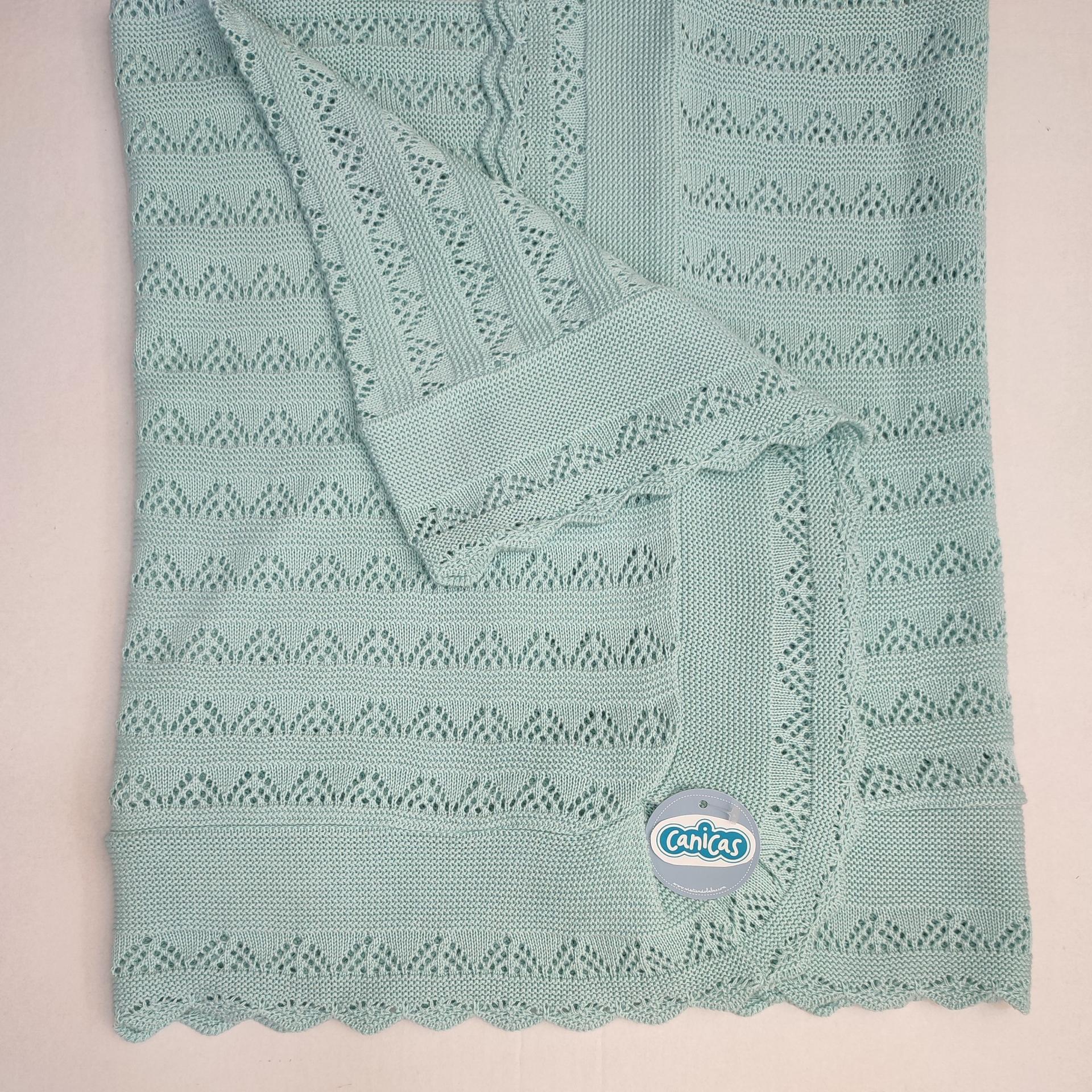 Original chal toquilla para bebé recién nacido de primavera verano. Confeccionada con un suave y fresco hilo perlé en color verde agua. Un tejido acrilico 50% antialérgico y algodón 50%, fibras naturales de tacto delicado y dulce, para que tu bebé luzca muy guapa y cómoda.