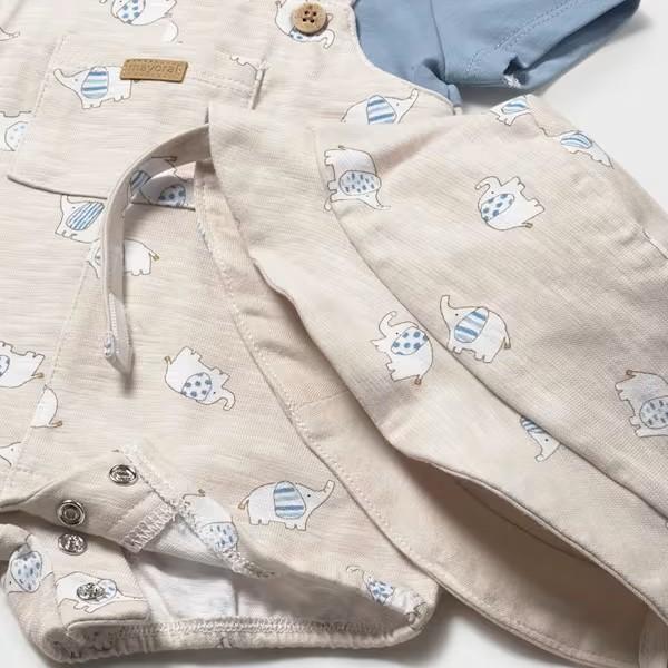 Pelele de manga corta para recién nacido. Lleva el cuello redondo. Simula peto con tirantes y camiseta. Cierre con botones a presión en la espalda y entrepierna para facilitar su puesta en el pequeño. Cómodo tejido de punto elástico en algodón sostenible BETTER COTTON.
