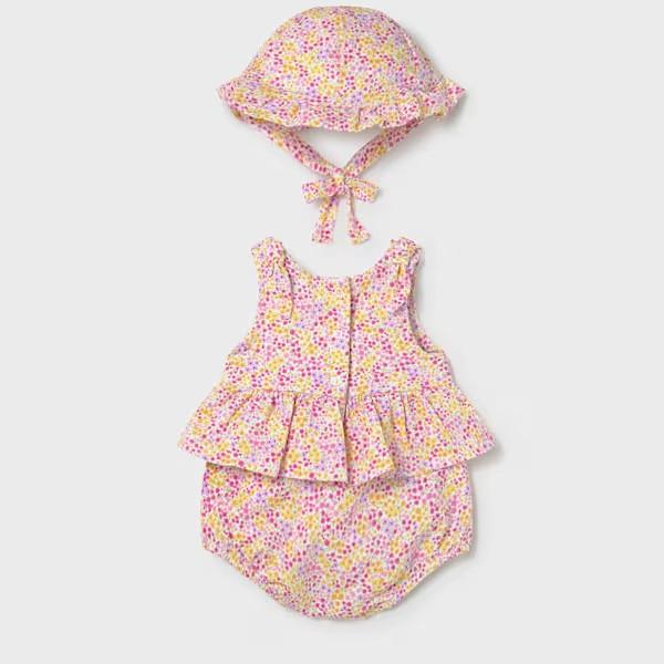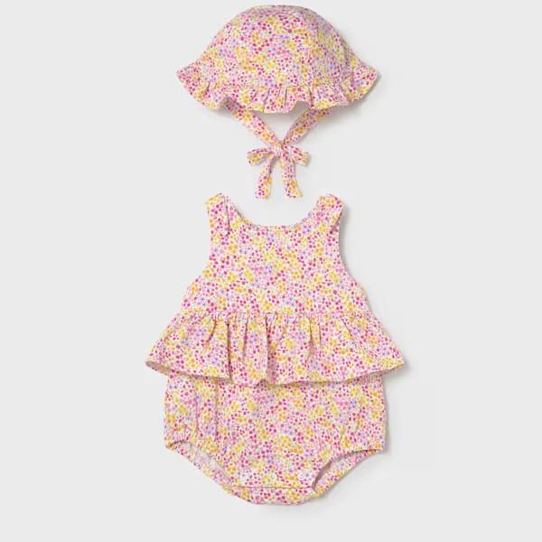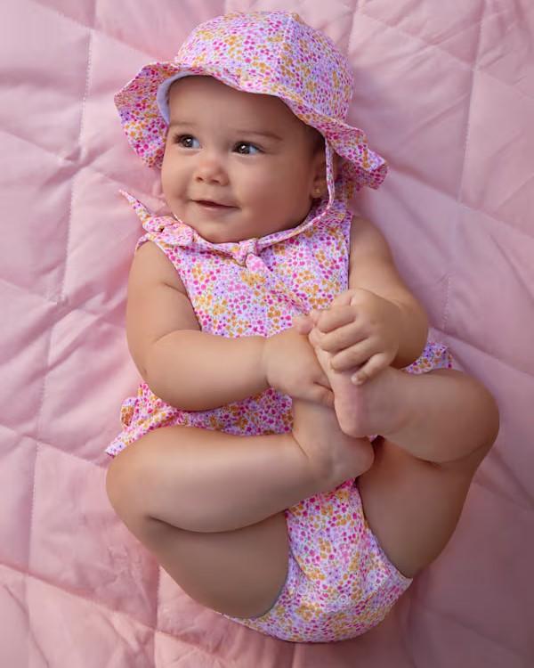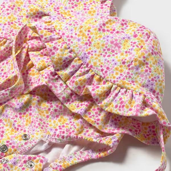 Pelele sin mangas para recién nacida. Lleva el cuello a la caja. Cierre con botones a presión en la espalda para facilitar su puesta en el pequeña. Cómodo tejido de algodón elástico estampado con pequeñas florecitas. Adorna volante del mismo tejido.