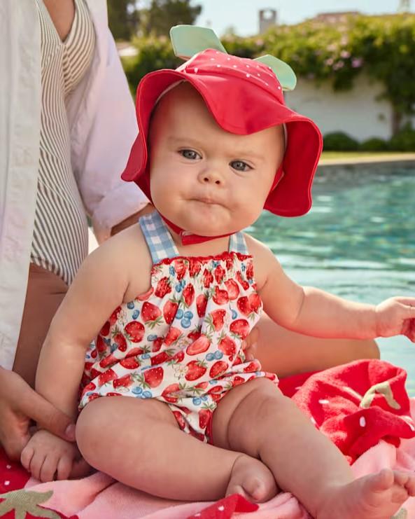 Camiseta en tirantes cruzados en la espalda con estampado de fresas a juego con el culetín. Gracioso gorrito a juego con volante.