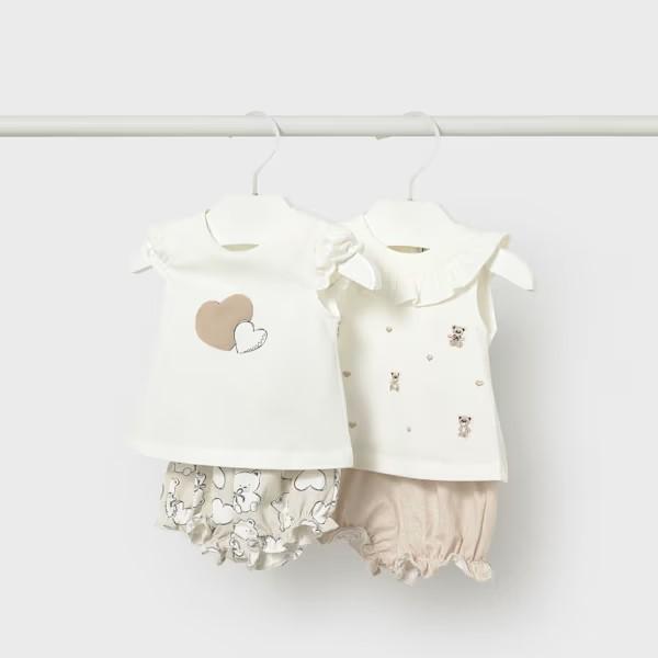 Original conjunto de algodón sostenible para bebé niña de cuatro piezas formado por dos pantalones/short y dos camisetas, intercambiables. Confeccionadas en un tejido fluido de algodón, ideal para los días más calurosos.