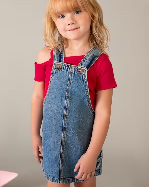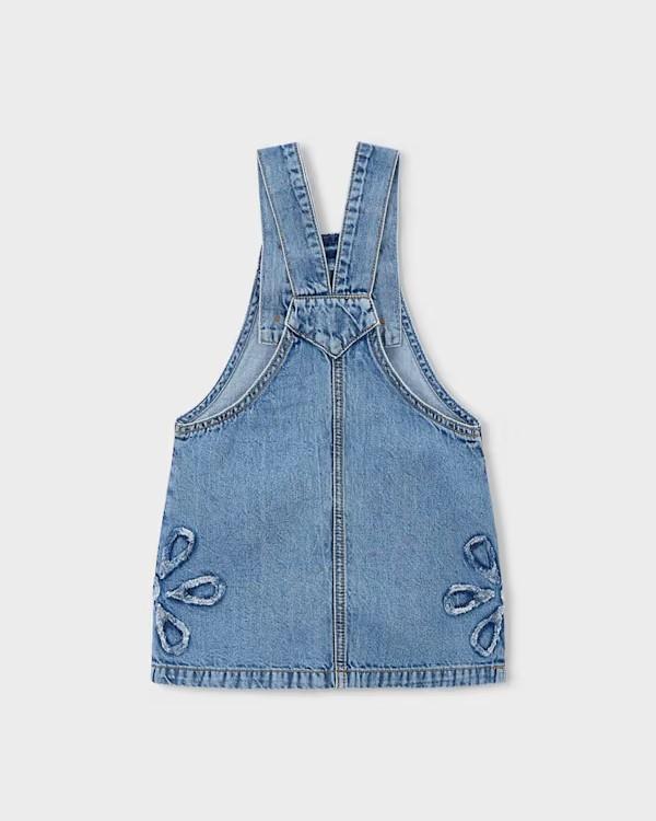 Vestido vaquero para niña confeccionado con ligero tejido vaquero de algodón. Lleva tirantes ajustables y cierra con botones en el delantero. Destaca por sus bordados de corazones en la falda.