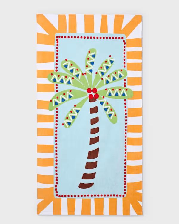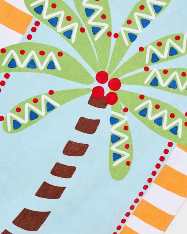 Original toalla de playa para niña. El diseño y composición de la misma es envolvente por lo que podrás secar y abrigar a tu pequeña después del baño. Original estampado con palmera.