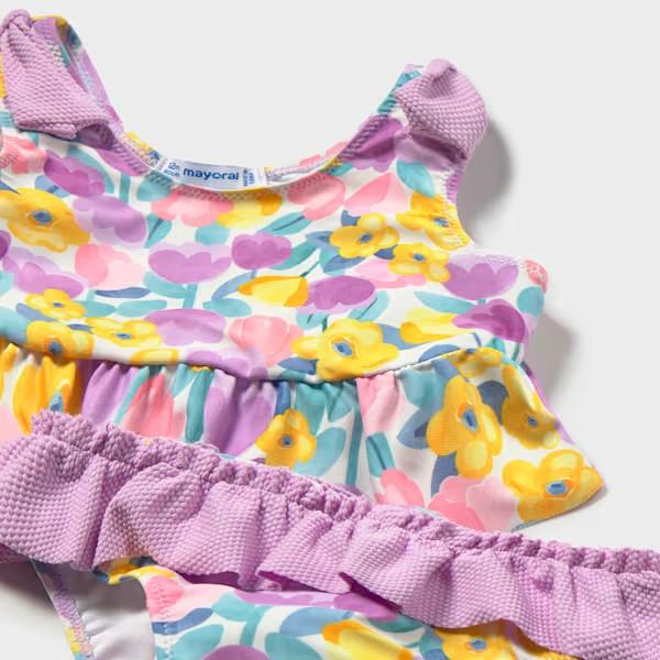Conjunto de baño en dos piezas para bebé niña. Bonito estampado con volantes en los hombros. Tejido fluido y elástico para una máxima comodidad en el día a día con secado rápido.