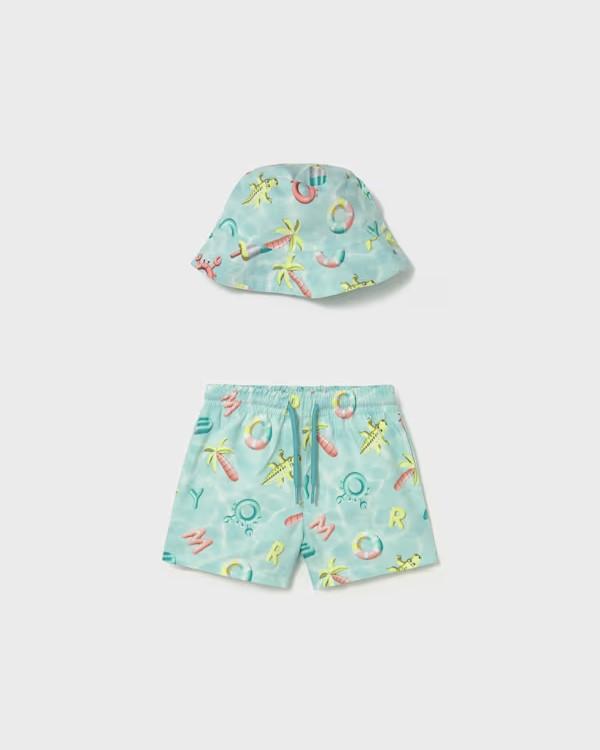 Original conjunto de baño compuesto por bañador y gorra reversible a juego para bebé niño. Colección verano.