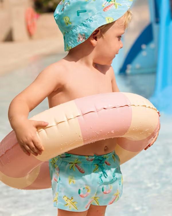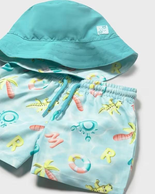 Bonito conjunto de baño para bebé niño formado por un bañador y gorra reversible con proteción solar.