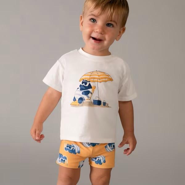 Conjunto para bebé ideal para la playa y la piscina. Formado por una camiseta de manga corta y un bañador corto con estampado combinado.