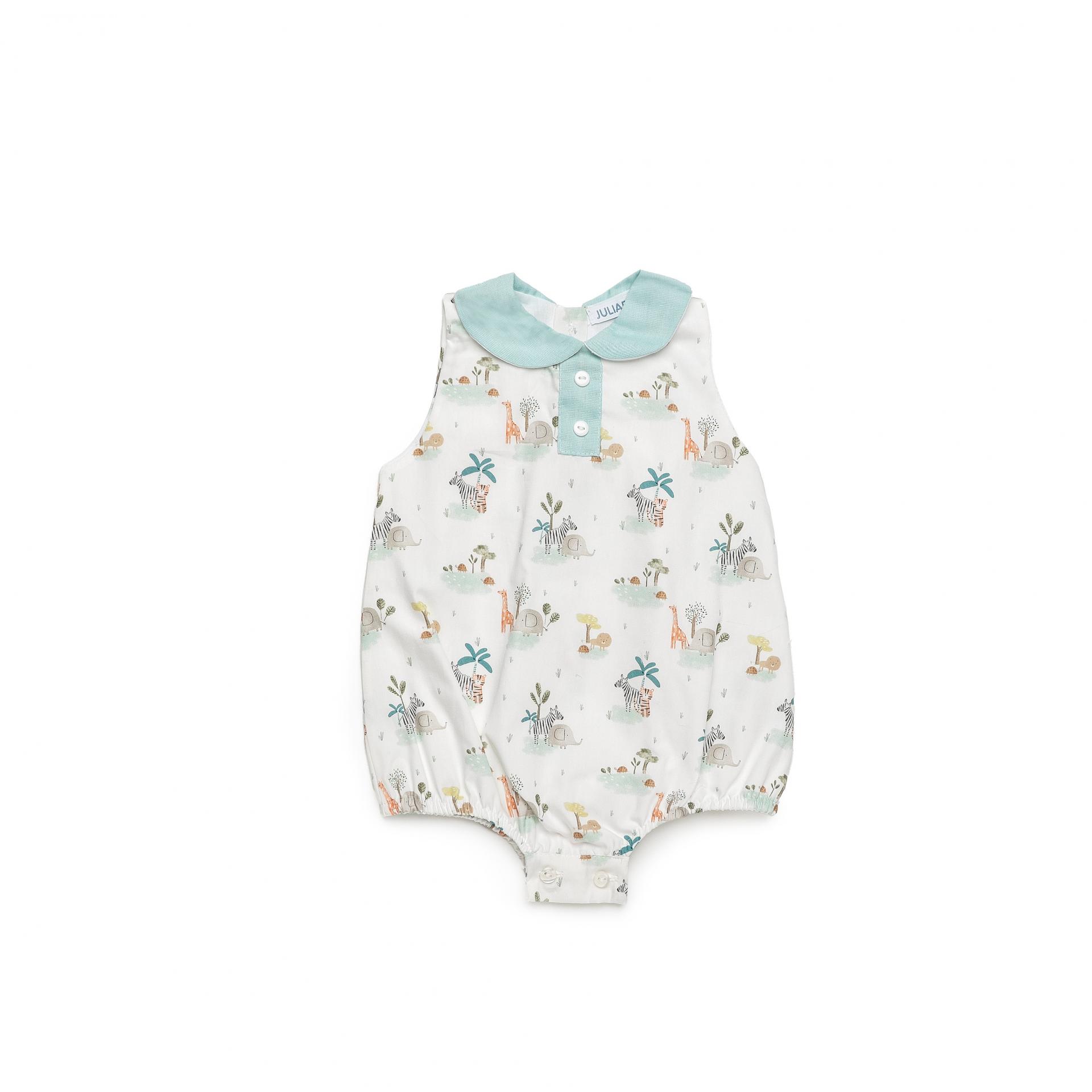 Precioso pelele sin mangas de la colección primavera/verano. Es una prenda ideal para recién nacido y lo puedes usar cada día por ser una ropa bebé muy cómoda. Confeccionado con tejido estampado safari de alta calidad muy suave y fresco.
