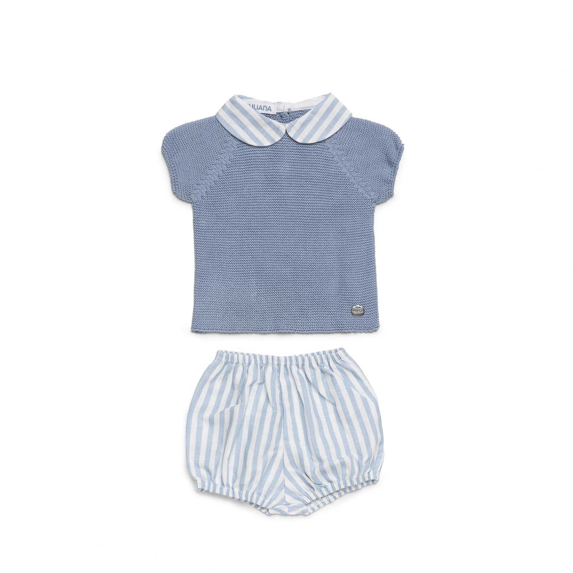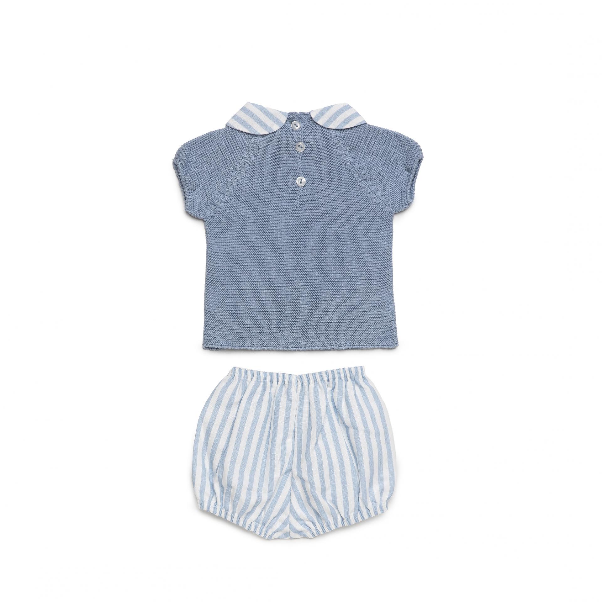 Pantalón corto rayado para bebé y jersey de hilo a juego. Colección primavera verano.