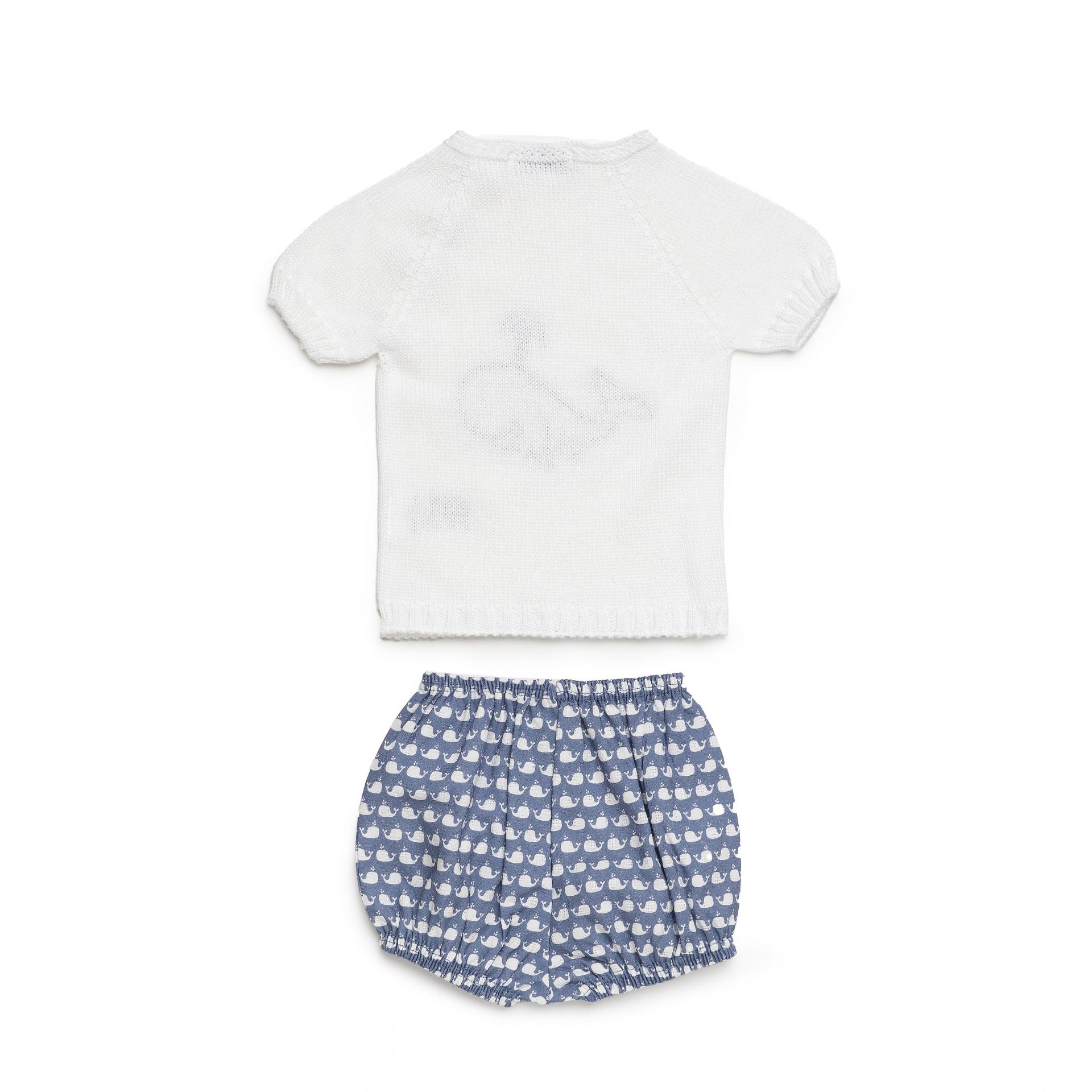 Pantalón corto estampado para bebé y jersey de hilo con aplique ballena en el delantero. Colección primavera verano.