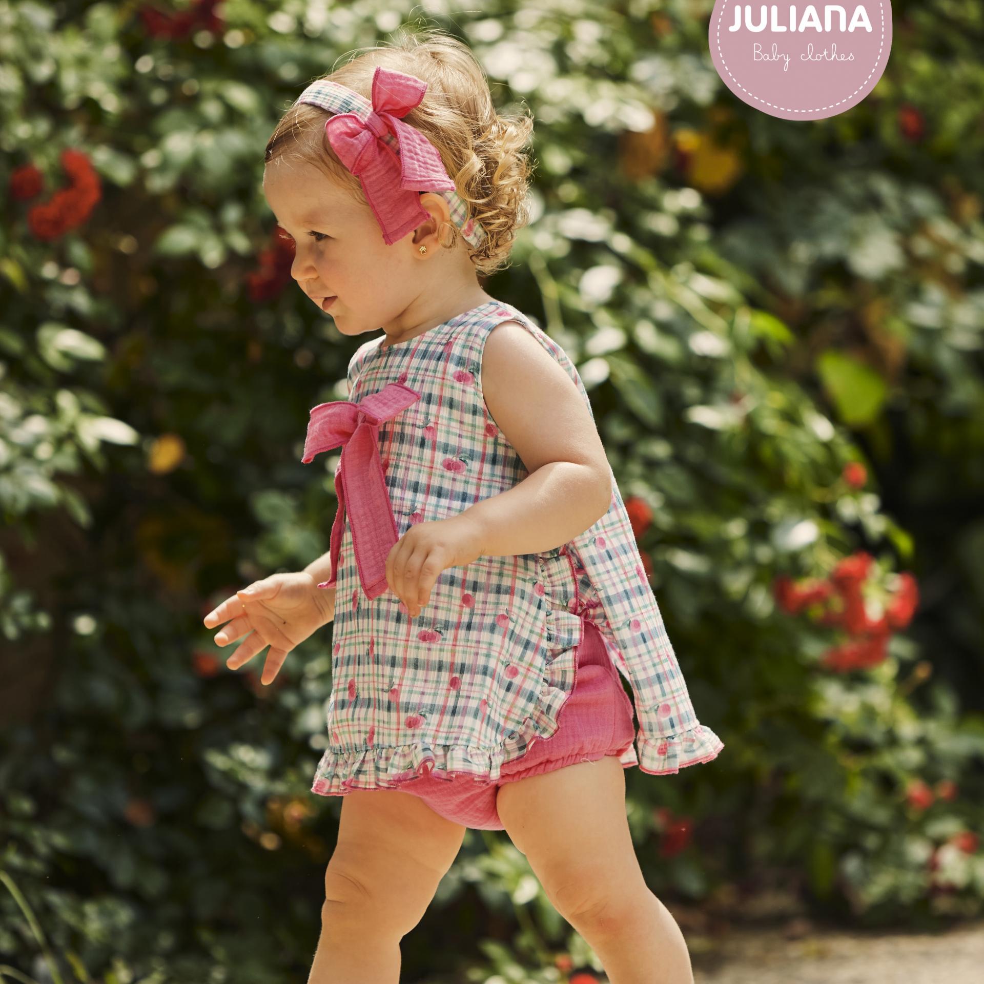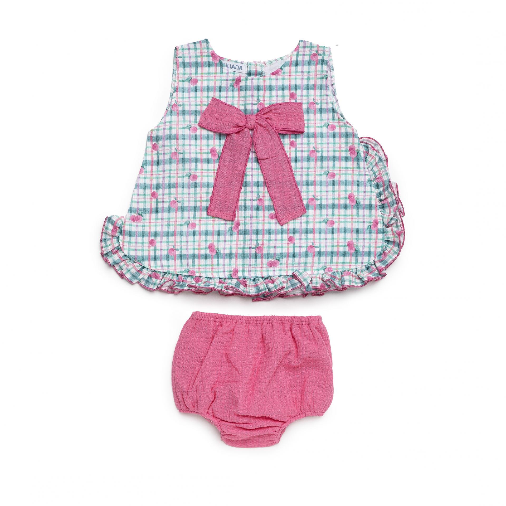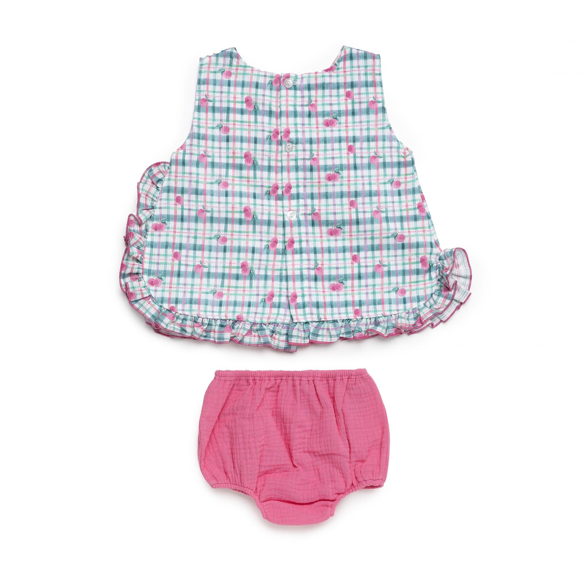 Cuello redondo y abotonado en la espalda para facilitar su puesta en la pequeña. Adorna lazo en el delantero de tela color fresa a juego con las braguitas.