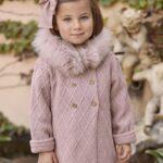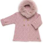 Abrigo de manga larga para bebé. Está confeccionado con un cómodo y cálido tejido de punto tricot liso con doble cara. Tiene un corte clásico y brocha con tres botones dobles en la parte delantera. Capucha del mismo tejido adornada con pelo natural en el mismo color.